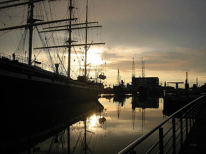 Vorbei an einem Dreimaster über spiegelglattem Wasser, in dem sich von der Nordsee her die Sonne spiegelt.