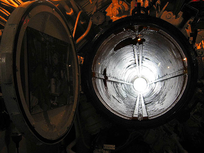 Fast wie ein Motiv aus einer Todesnähe-Beschreibung kommt dieses Bild daher, das das hier offene (und sonst stets unter der Wasserlinie befindliche) rund 8 Meter lange Torpedorohr zeigt. Eines von insgesamt 6, die bei Angriffsabsicht geflutet wurden, um durch die geöffneten Bugtorpedoklappen die todbringende Primärwaffe des Bootes abzufeuern. Beim Typ XXI ist dies jedoch nie im Ernstfall so geschehen, denn nur ein einziges Boot dieser Bauart war je im Fronteinsatz, blieb dort aber ohne Gefechte. |