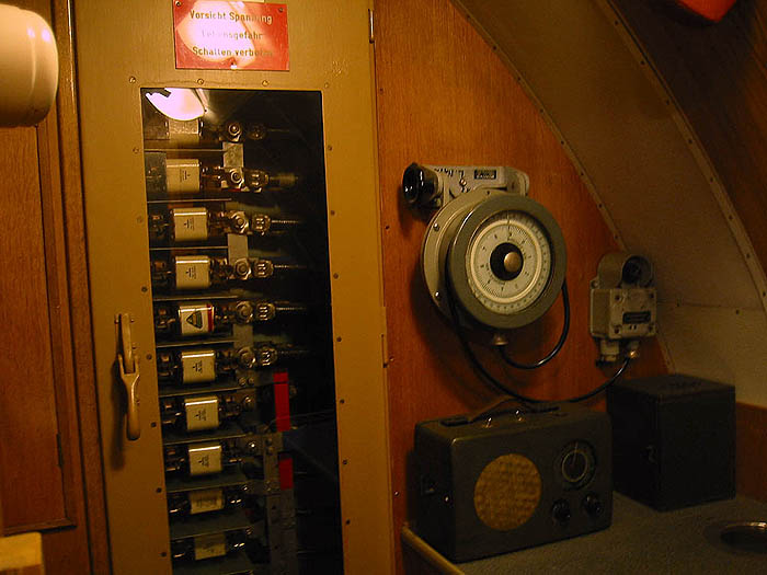 | Da wir uns in der Eile unseres Besuches nicht merken konnten, was genau diese Apparaturen darstellen (vermutlich einige Hauptsicherungen und ein Teil der neuartigen "Nibelungen"-Sonar-Anlage), hier vielleicht einmal einige (für noch größere Laien als uns sicher interessante) Anmerkungen zur Bauweise eines solchen Ubootes. Im Bild oben sieht man rechts die gewölbte Innenwand des Druckkörpers, einem riesigen Stahlzylinder aus mehreren Sektionen, der verborgen in der Außenhülle des Bootes den eigentlichen Innen- und Lebensraum des Tauchfahrzeugs bildete. Bei der für Typ-XXI-Boote üblichen Gefechtstauchtiefe von 220 Metern übte die Wassersäule über dem Boot dabei einen Druck von mehreren hundert Kilogramm pro Quadratzentimeter aus, dem man durch einen erhöhten Innenluftdruck natürlich nur sehr begrenzt entgegenwirken konnte. Auch den Detonationen von Wasserbomben in unmittelbarer Nähe sollte diese künstliche Luftblase dabei zumindest punktuell noch trotzen können. |