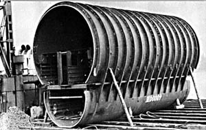 Bei einer errechneten Zerstörungs-tauchtiefe von 330 Metern konnte der stählerne Leib des Bootes (links) somit einem auf ihm lastenden "Gewicht" standhalten, das dem eines Wolkenkratzers gleichkommt! Man stelle sich einmal bildhaft vor, daß die 300 Meter hohe Frankfurter Commerzbank auf diesem Stahl-zylinder von 1945 hätte ruhen können, ohne ihn zu zerquetschen! |