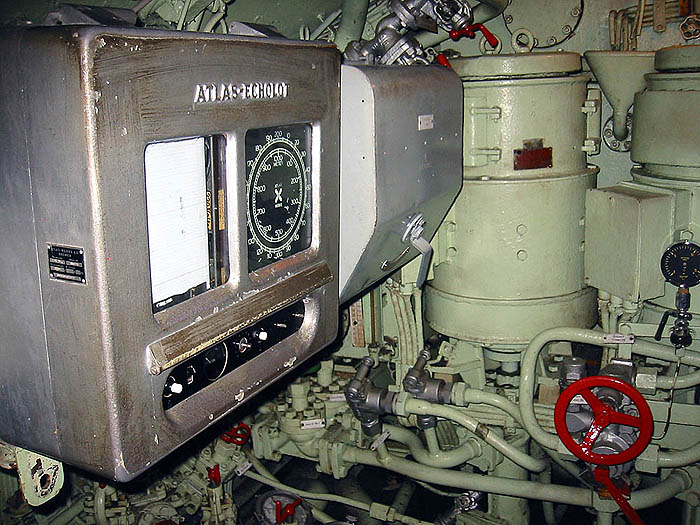 feindlicher Ziele aussenden konnte. Die Echolotanlage hier ist verbunden mit Sender/Empfänger am Kiel des Bootes und kann Tiefen bis 1000 Meter präzise ausloten. |