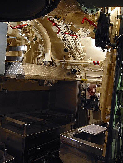 Ebenfalls die Luxusausführung einer Küche. Hier bereitete der Smutje dreimal täglich Mahlzeiten für über 50 Mann - bei jedem Seegang. Im Gegensatz zu älteren Bootstypen verfügte das Typ XXI aber bereits über einige Kühlfacher! Den Dunstabzug gab's allerdings schon beim Typ VII. |