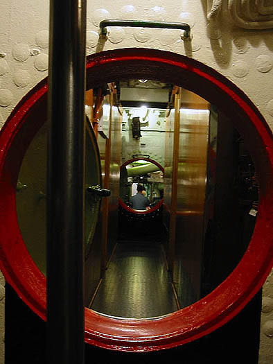 Blick nach achtern durch die Sektion mit den Mannschaftskabinen hinter den furnierten Stellwänden links und rechts.
