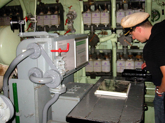 Schlörb vor einer Werkbank mit Schraubstock quer vorm Backbord-Diesel (links). Der Dieselraum mutete aufgrund seiner großzügigen Deckenhöhe wie eine Kathedrale an, erst recht im Vergleich zum Maschinenraum auf U995, das wir danach besuchten! Im Hintergrund zu erkennen: fest installierte Kalifilter der Firma Dräger, die zum Lufterneuerungssystem des Bootes gehören. Sie binden den bei längeren Tauchfahrten gefährlich ansteigenden Kohlendioxydgehalt aus der Atemluft. Es gab noch einige hundert tragbare Kalipatronen für die Mannschaft, sogenannte "Dräger Gegenlungen". |
