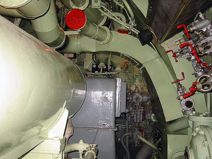Blick nach achtern hinterm Backbord-Diesel vorbei. Vermutlich sichtbar: Teile der Lufterneuerungsanlage