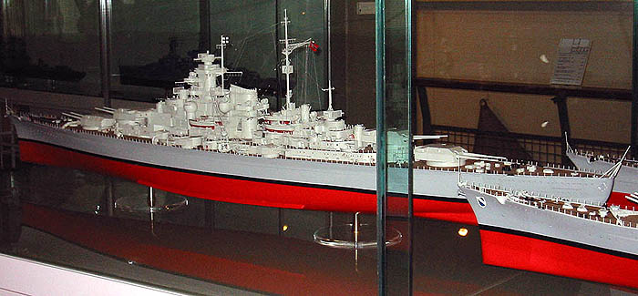 Mit seinen rund 250 Metern Länge der Stolz der Kriegsmarine. Leider wurde das majestätische Schlachtschiff gleich auf seinem ersten Gefechtseinsatz "Rheinübung" durch einen Millionentreffer aufs Ruder manövrierunfähig geschossen und nach stundenlangem Beschuß von der Besatzung selbstversenkt. |