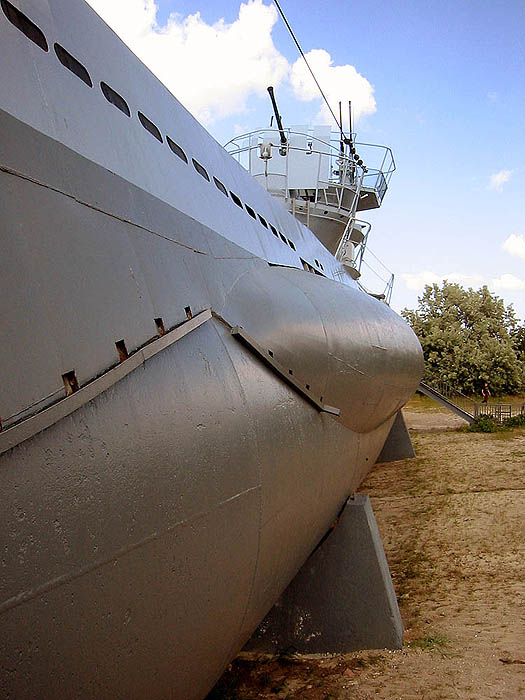 Hier gut zu erkennen sind die seitlich angebrachten Satteltanks, in denen sich Tauchbunker, Regelbunker, Regelzellen und Untertriebszellen befinden. Bei den älteren Typ II Booten waren diese noch innerhalb des Bootskörpers angebracht. Von seiner Außenhülle fast den Rumpfausmaßen einer Boeing 747 gleichkommend, beträgt die Länge des Druckkörpers (des eigentlichen Innenraumes des Bootes) nur etwa 49 Meter. Diese Zahl bitte merken und weiterklicken zu den Innenaufnahmen! |