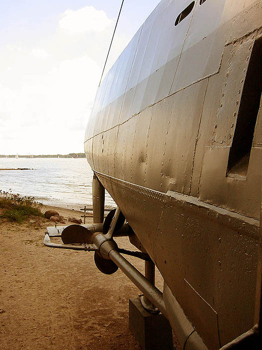 Blick über den 'Hintern' des schlanken Bootes mit Schraube, Tiefen- und Seitenruder.