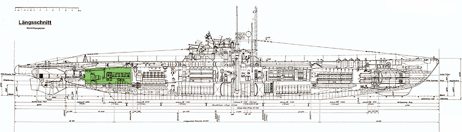 Die Öffnung des Hecktorpedorohrs oben markiert den hintersten Bereich des Druckkörpers, also dem Innen- und Lebensraum des Bootes. Von hier aus sind es etwa 49 Meter bis zwischen die vorderen Torpedorohre. Das entspricht etwa dem Abstand zwischen zwei Barken auf der Bundesstraße. Man stelle sich nun bildhaft vor, wie bis zu 50 Mann wochenlang auf einer Fläche zusammenleben, die jenem Barkenabstand entspricht und an ihrer breitesten Stelle in der Mitte nur etwa 5-7m breit ist, sonst meist nur 2-3 Meter beträgt, da ja ein Großteil des Innenraumvolumens mit Maschinen und sonstigem Mobiliar vollgepackt ist. Ergo: zwei Schulklassen auf etwa 200m² "Wohnraum" - niedrige Deckenhöhen, engste "Türen", anfangs alles vollgestopft mit Proviant und Torpedobewaffnung, rudimentäre Luftumwälzung, keine Fenster, keine Dusche und kein regelmäßiger Kleiderwechsel, dafür aber mitunter Schwerstarbeit und Bombenterror von oben. Ein Uboot ist also in der Tat kein Luxusdampfer! |