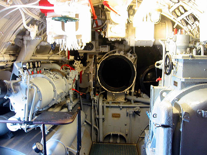 Durch eine nachträglich für den Museums-Betrieb eingebaute Tür betritt man den Heckraum (Blick nach achtern). Von hier aus wurden Torpedos aus dem Hecktorpedorohr ausgestoßen. Hier waren auch die Elektromotoren untergebracht, die das Boot während der Tauchfahrt antrieben. |