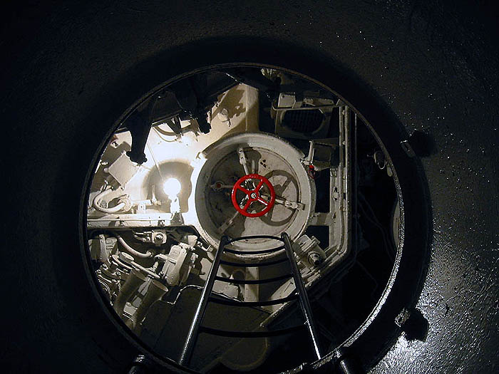 Leider ist auch hier der Turm für Besucher nicht zugängig. Dort auf der Brücke befindet sich das Angriffssehrohr, Gegenstück zum Luftzielsehrohr unten in der Zentrale