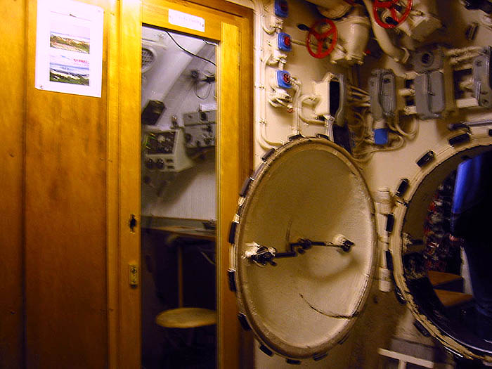 Im Offiziersschlafraum gegenüber dem Kommandantenraum liegt der Funkraum. Hier wurden Befehle empfangen und Meldungen über Kontakte und Wetter gefunkt. Die Glastür wurde erst später eingebaut. Normalerweise befand sich hier eine Falttür. |