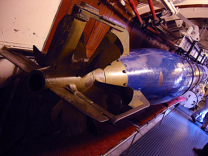 Ein sogenannter "Aal" in seiner Aufhängung. Der Torpedo wurde hier gefettet und – bei Einsatz von elektrisch betriebenen Torpedos – auch in bestimmten Zeitabständen frisch aufgeladen. Danach wurde er über die Schiene in das Ausstoßrohr geschoben. Schön zu erkennen sind die Doppelpropeller, die den Aal angetrieben haben. |